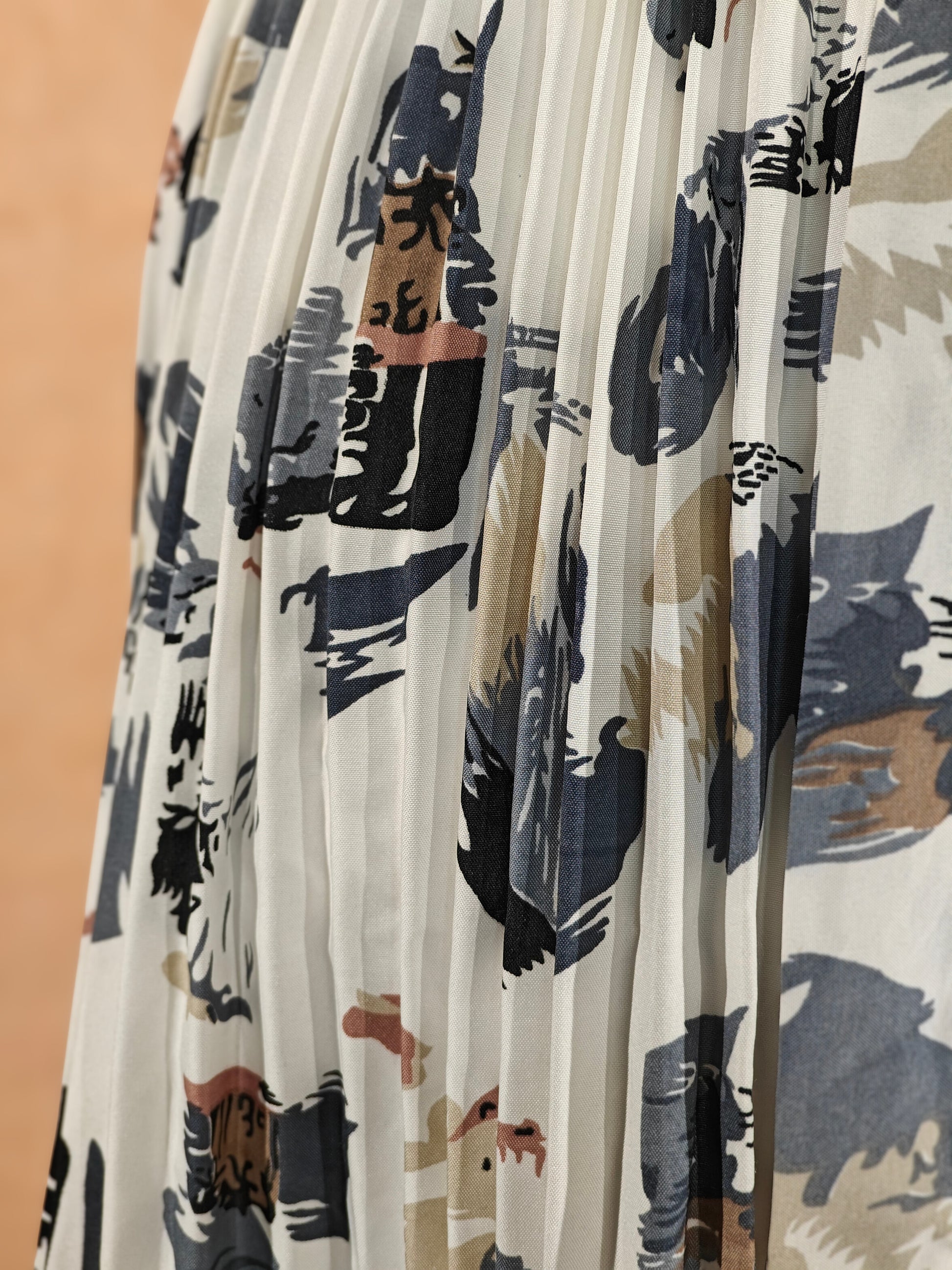 Sleeveless dress with a V-neck and unique abstract print featuring shades of grey , black and tan. It has a fitted waist and flows, pleated skirt.